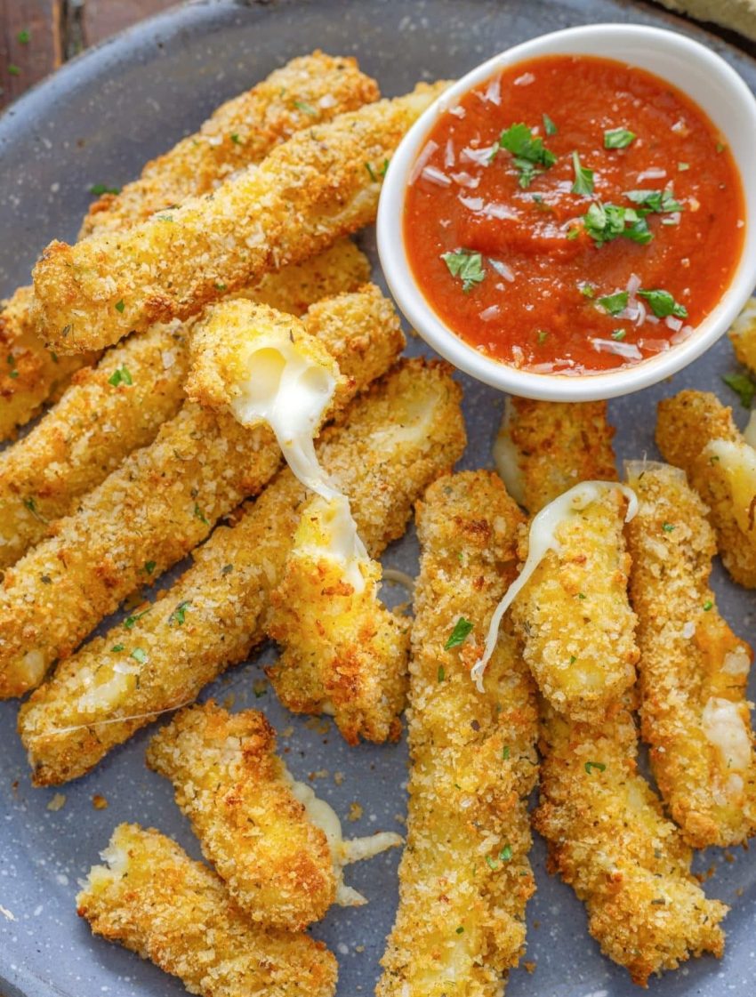 Return the breaded mozzarella sticks to the freezer for at least 30 minutes. This step sets the coating and ensures the cheese stays inside while cooking. You may freeze them for up to 24 hours before air frying if preparing ahead.