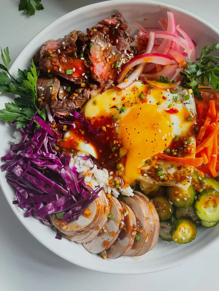 Drizzle the prepared bibimbap sauce over the top, or serve it on the side for diners to mix in themselves.