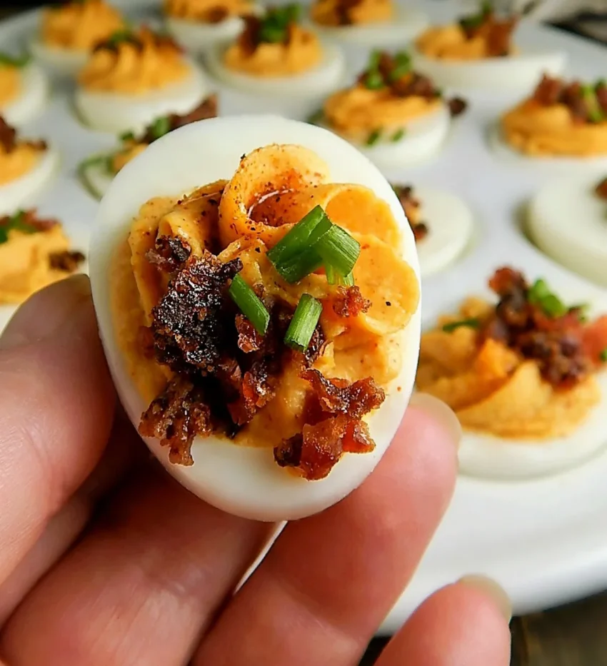 Lightly sprinkle paprika or smoked paprika over the filled eggs. Add finely chopped chives or parsley if desired.