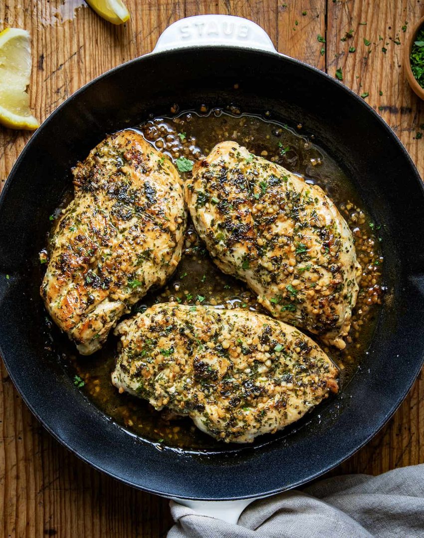 - Pour the remaining lemon garlic mixture over the chicken while it cooks. This creates a light sauce.