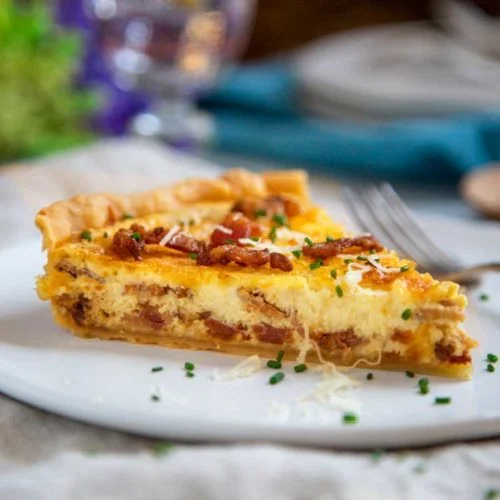 Serve warm or at room temperature. Quiche Lorraine pairs well with a simple green salad dressed with a light vinaigrette.